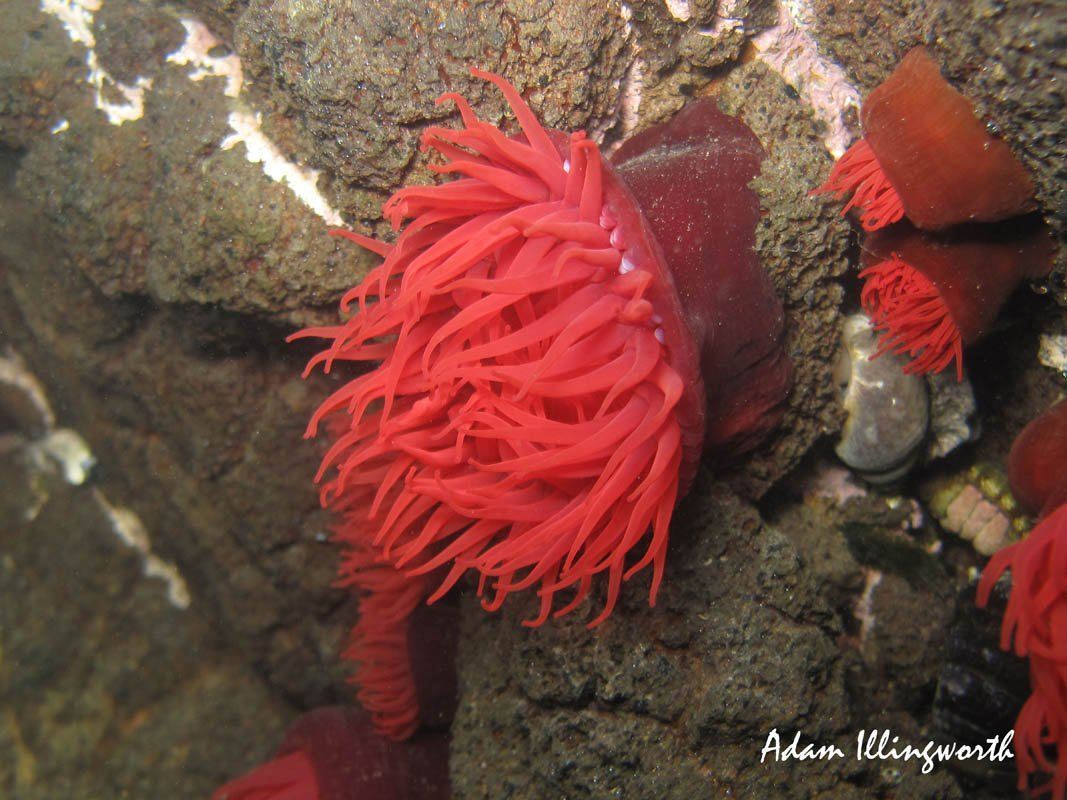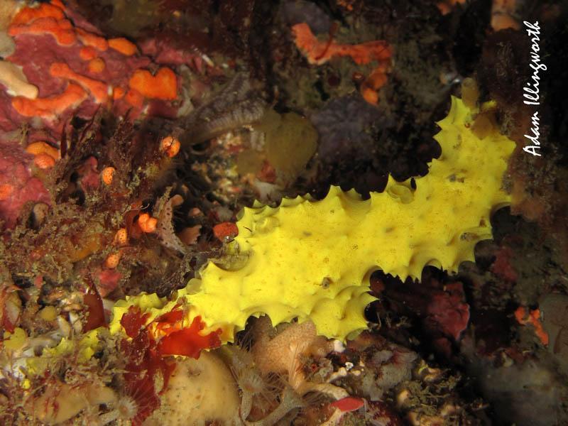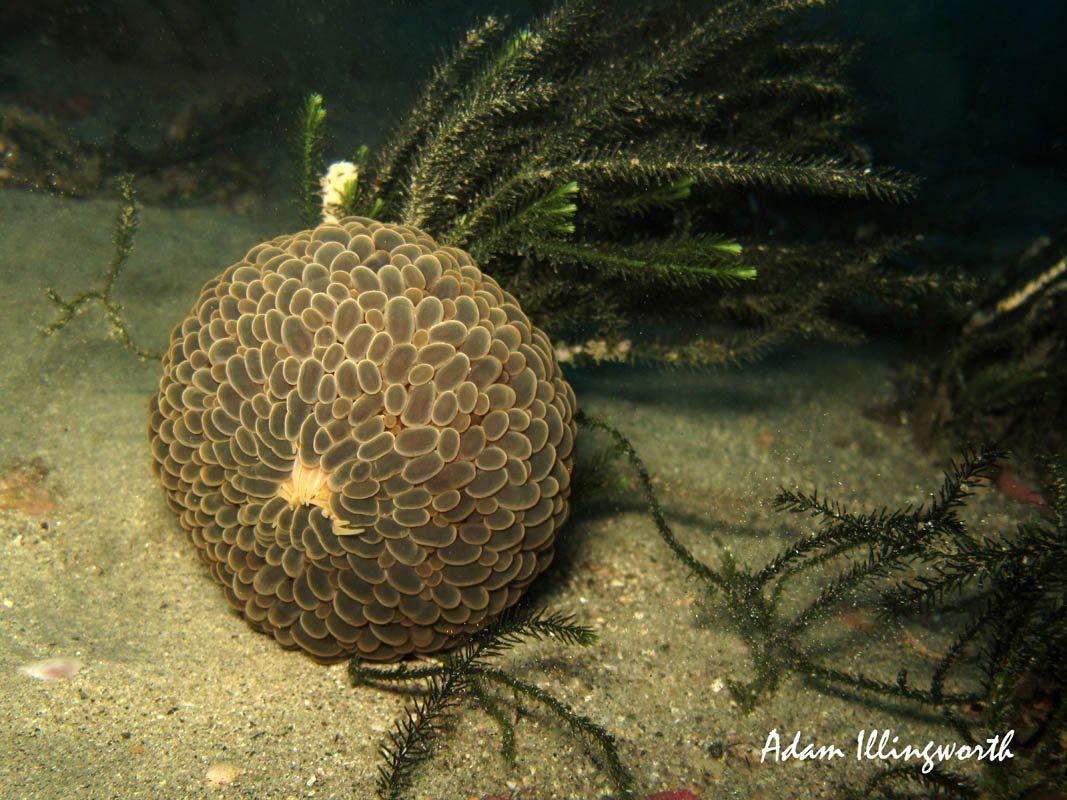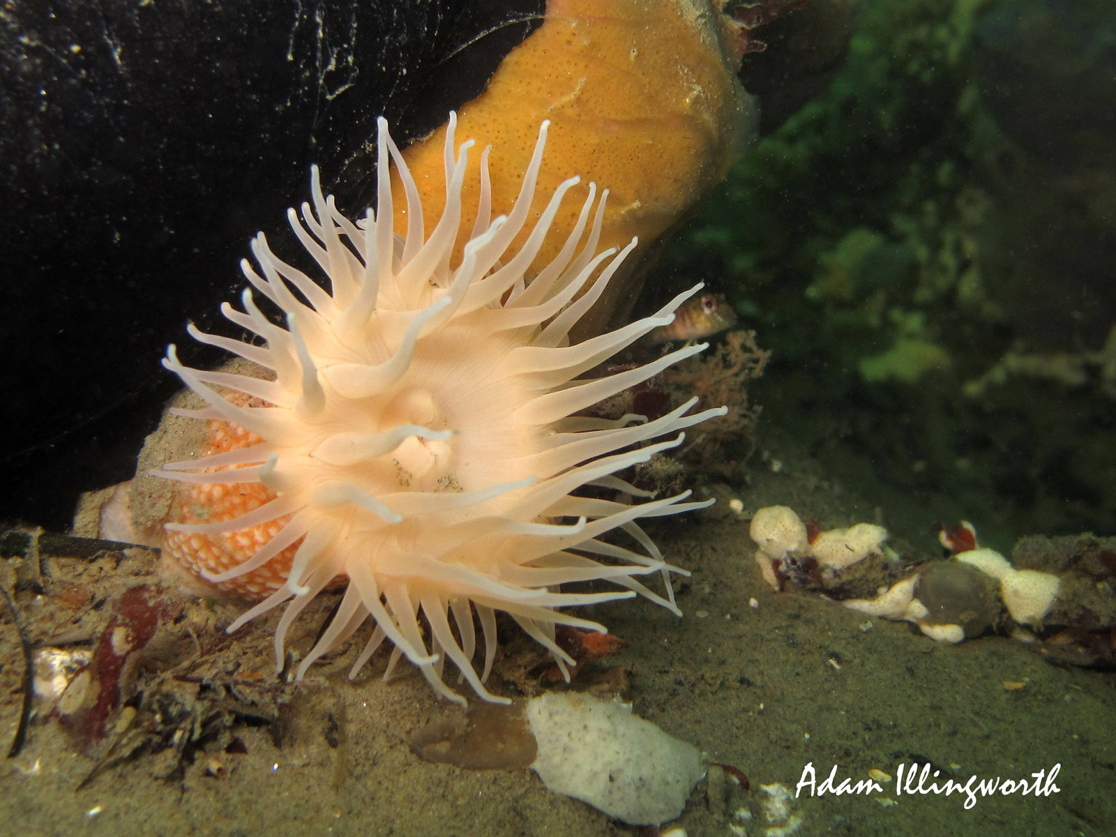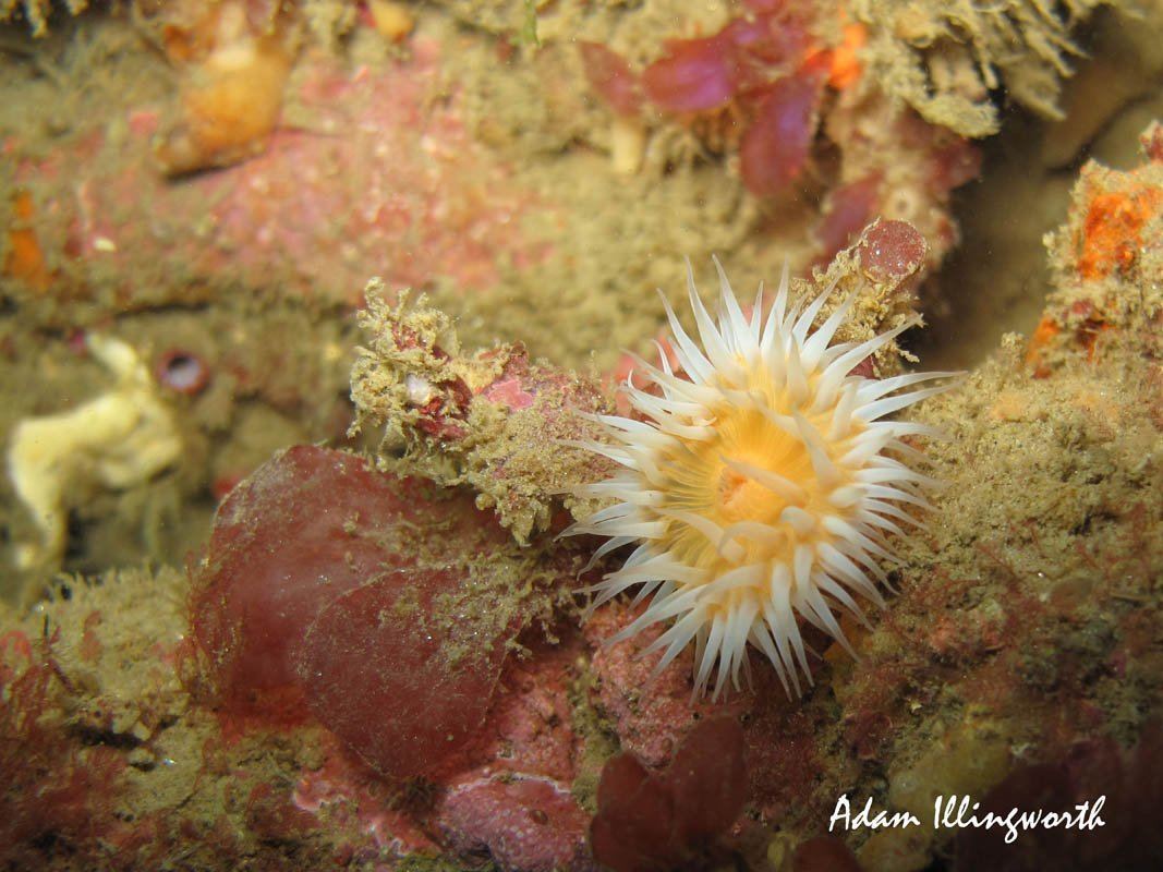 The apricot anemone is a large anemone with a golden, orange or apricot coloured column that is covered in small pale verrucae, and white tentacles.