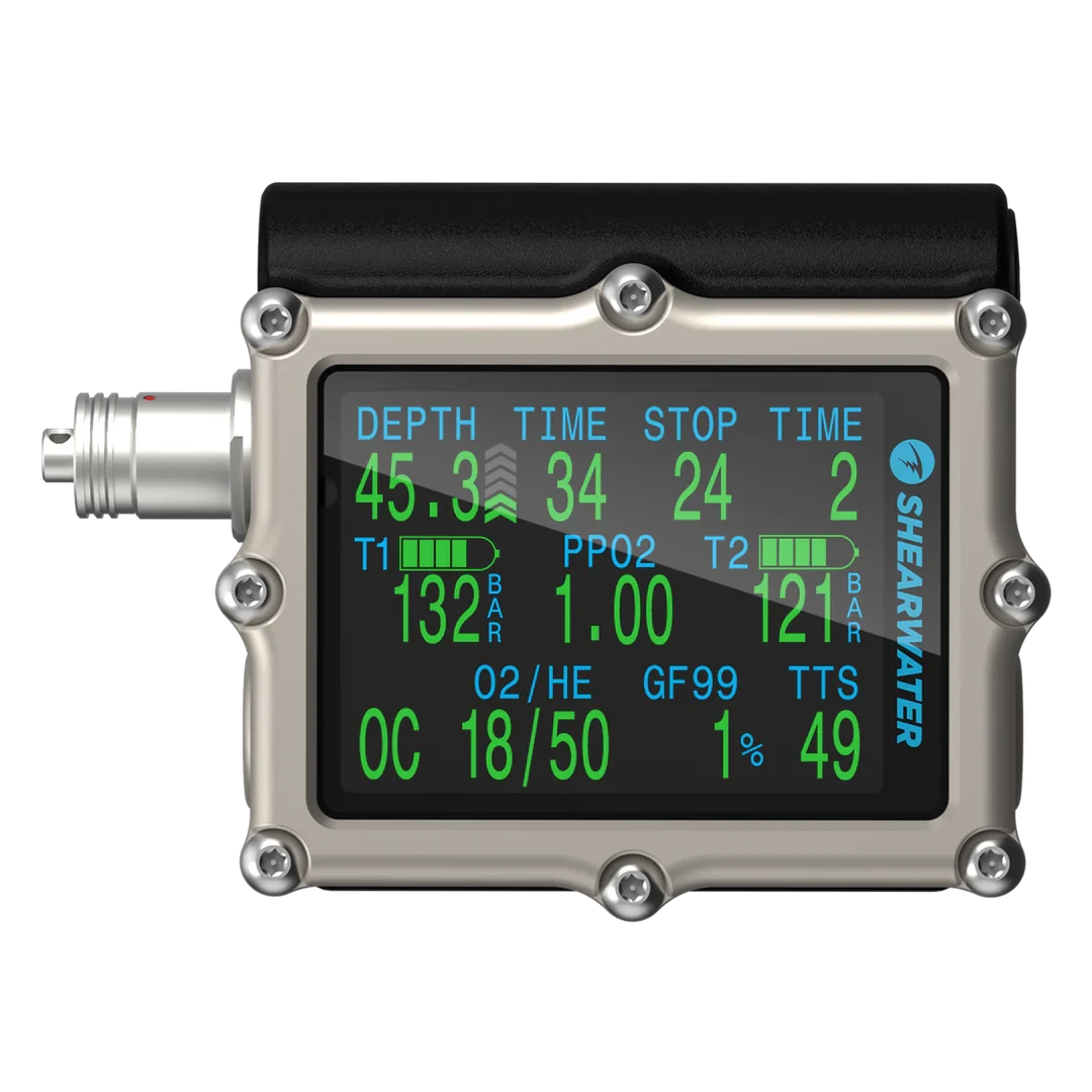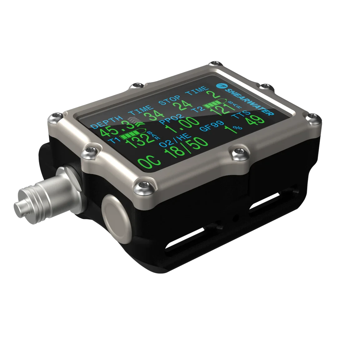 Petrel 3 is a rugged, high‑performance dive computer built in Canada for serious divers from recreational to technical and rebreather use. It features a large, bright 2.6″ AMOLED display protected by toughened glass and a titanium bezel for excellent underwater visibility and durability. With intuitive two‑button navigation, customizable alerts and a user‑replaceable AA battery for long dive times, Petrel 3 adapts to any dive environment. Air integration supports up to four Shearwater transmitters for real‑time tank pressure monitoring, and a digital compass adds confidence underwater. Advanced dive modes include Air, Nitrox, Trimix, OC Tec, CC/BO and Gauge, making this versatile dive computer ideal for deep and technical diving.